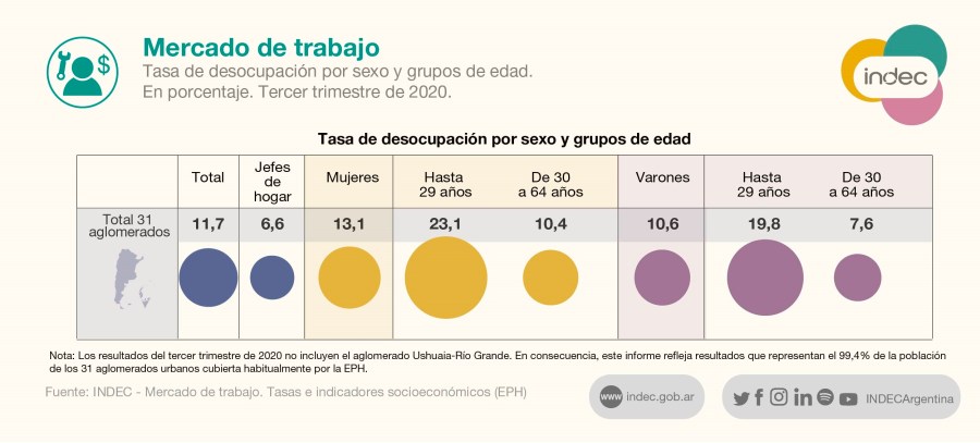La tasa de desocupación fue de 11,7% al término del tercer trimestre del año, lo que representó un incremento de dos puntos porcentual respecto al 9,7% de igual período de 2019, informó hoy el Instituto Nacional de Estadística y Censos (Indec).