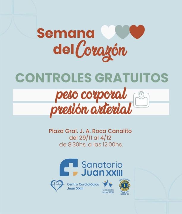La denominada «Semana del Corazón» buscará sensibilizar a todas las personas sobre el cuidado del principal órgano del sistema circulatorio y la detección de factores de riesgo cardiovascular. Es por eso que, desde el Sanatorio Juan XXIII, el Centro Cardiológico, Fundación Juan XXIII y el Club de Leones, realizarán 30° edición de la Semana del Corazón, en la plaza del canalito, ubicada en calle Isidro Lobos y Avenida Roca.