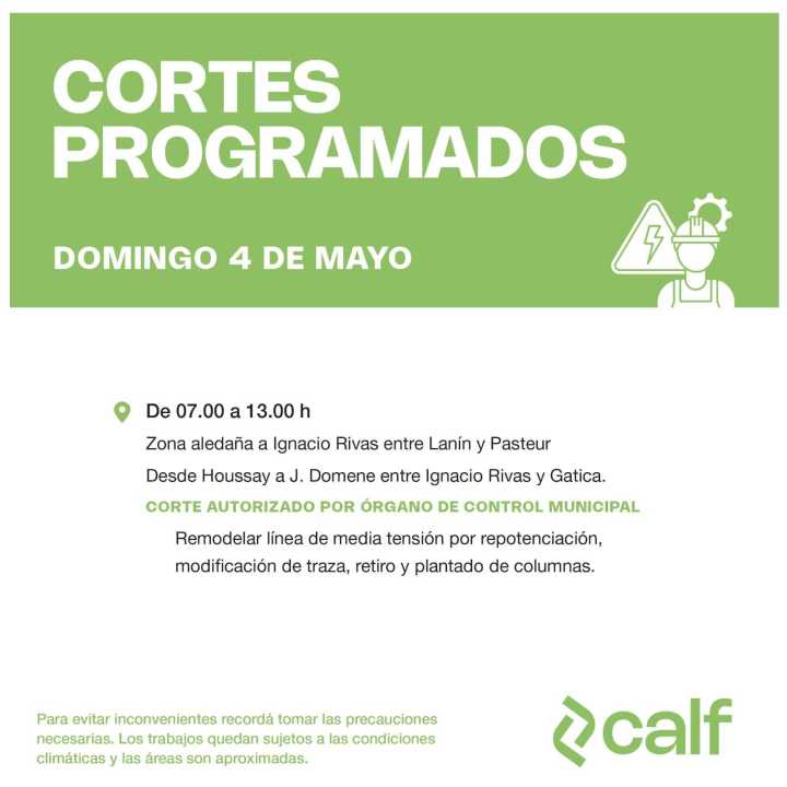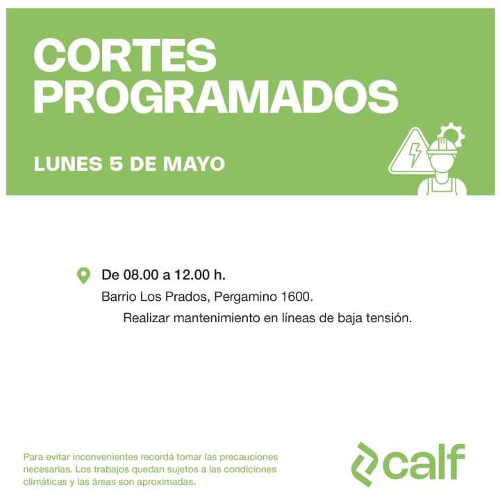 CALF anunció corte de luz en la capital neuquina para este domingo 4 de mayo desde las 7 hasta las 13, por lo que podría durar hasta seis horas.