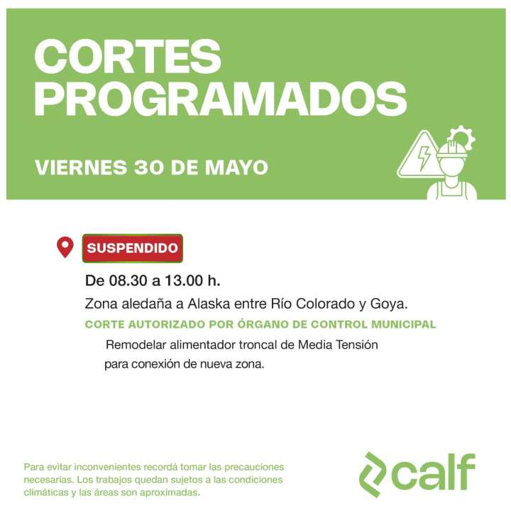 La Cooperativa de Agua, Luz y Fuerza (CALF) de Neuquén había anunciado un nuevo corte para este viernes 30 de mayo. Sin embargo, luego comunicó que quedaba suspendido hasta nuevo aviso: «Se produjo un cambio por consiguiente se suspende el corte programado de mañana». Esta semana ya se registraron interrupciones del servicio el martes y miércoles por tareas de mantenimiento.
