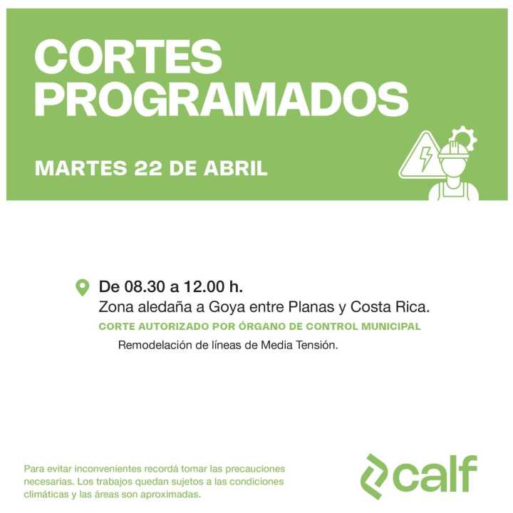 Desde Calf informaron que este martes 22 de abril habrá cortes de luz en la zona de Goya, entre Planas y Costa Rica. Será de 8.30 a 12.00 y se debe a obras de remodelación de líneas de Media Tensión.