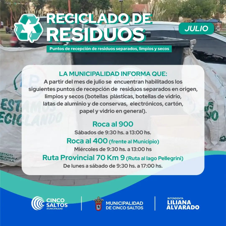 Desde el gobierno de Cinco Saltos anunciaron que la ciudad contará con diferentes puntos de reciclado. Detallaron que empezarán a funcionar en diferentes horarios a partir de julio. Enterate de qué se trata este nuevo servicio.