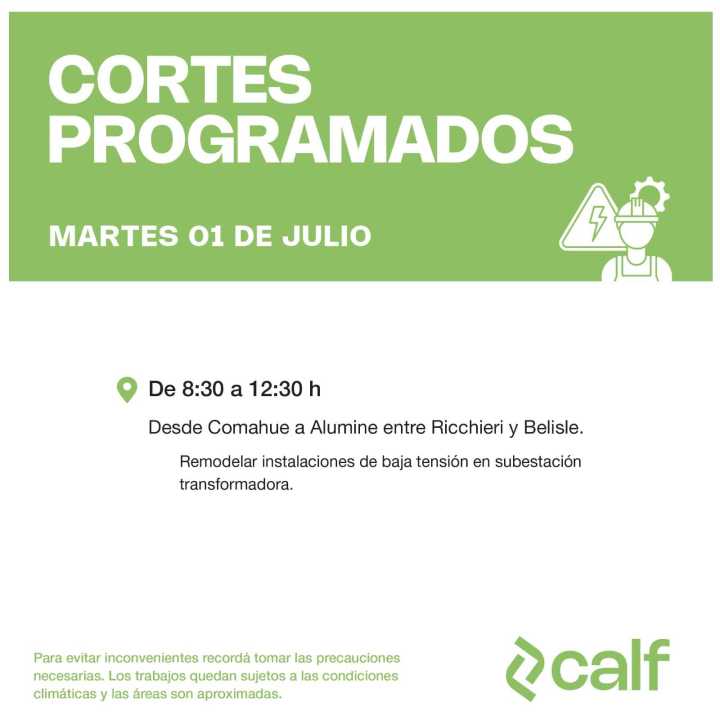 Uno de los cortes de luz programados será este martes 1 de julio en Neuquén. Será desde las 8.30 hasta las 12.30.