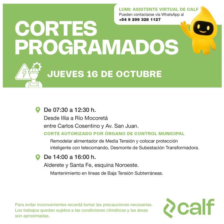 La Cooperativa de Agua, Luz y Fuerza de Neuquén (CALF) informó nuevos cortes de luz que afectarán distintos puntos de la ciudad este jueves. Las interrupciones durarán hasta cinco horas y por ello solicitaron tener en cuenta los horarios para prevenir cualquier situación.