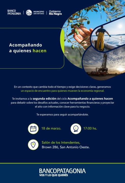 Con el objetivo de acercar herramientas crediticias y de desarrollo al sector privado, el Banco Patagonia dará inicio a la edición 2026 de su ciclo "Acompañando a quienes hacen". La primera jornada se llevará a cabo este miércoles 18 de marzo a las 17 horas en el Salón de los Intendentes, ubicado en la calle Brown 286 de la ciudad de San Antonio Oeste.