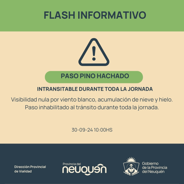 Las fuertes nevadas y el viento blanco complican la situación en el paso internacional Pino Hachado, que permanecerá cerrado desde este lunes. Según el último reporte, se espera que las condiciones mejoren para mañana, cuando se evaluará la posibilidad de habilitar el cruce.