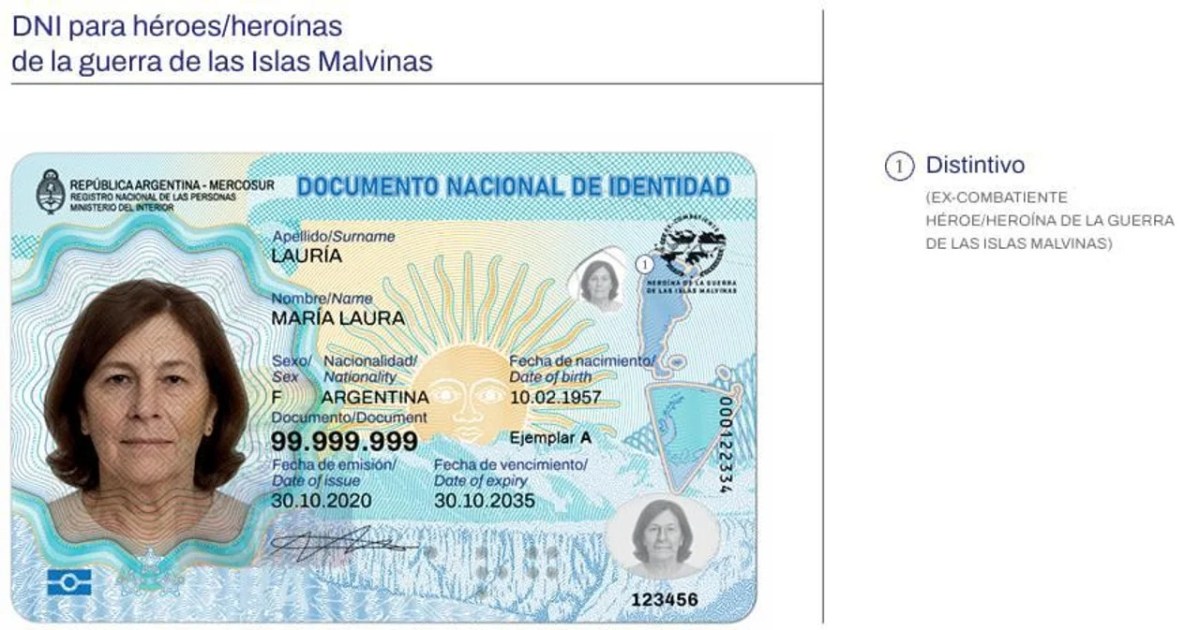 El nuevo diseño mantiene el homenaje a los veteranos del conflicto del Atlántico Sur. Aquellas personas que acrediten su condición llevarán impreso en el frente, arriba de la foto, el distintivo con la leyenda: «EX COMBATIENTE, HÉROE/HEROÍNA DE LA GUERRA DE LAS ISLAS MALVINAS».