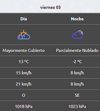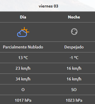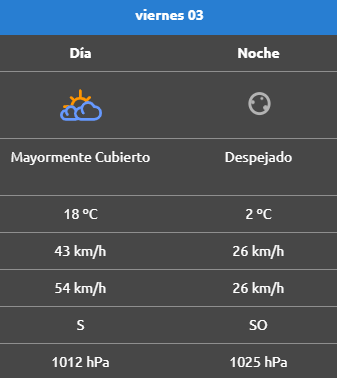 Por la noche la mínima será de 2°C, mientras que el viento cambiará de rumbo hacia el sudoeste a 26 km/h.
