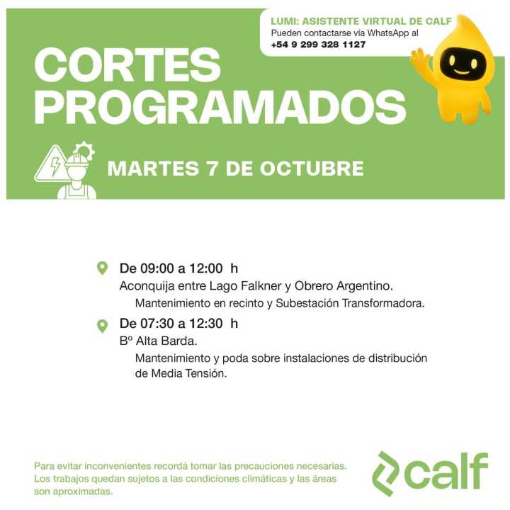 La Cooperativa de Agua, Luz y Fuerza de Neuquén (CALF) informó sobre un nuevo corte de luz este martes 7 de octubre. Será en la zona sur de Neuquén y en barrio Alta Barda alrededor de cuatro horas. El detalle de las zonas afectadas por la interrupción al servicio eléctrico.