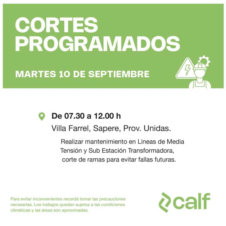 Desde la cooperativa CALF comunicaron los cortes de luz programados en Neuquén para este martes 10 de septiembre.