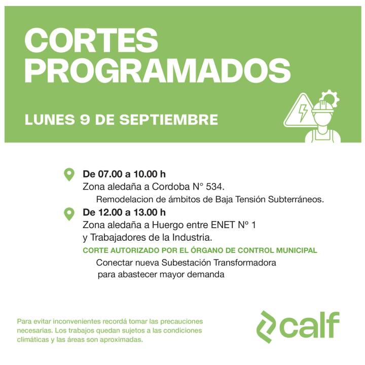 Desde la cooperativa CALF comunicaron los cortes de luz programados en Neuquén para este lunes 9 de septiembre.