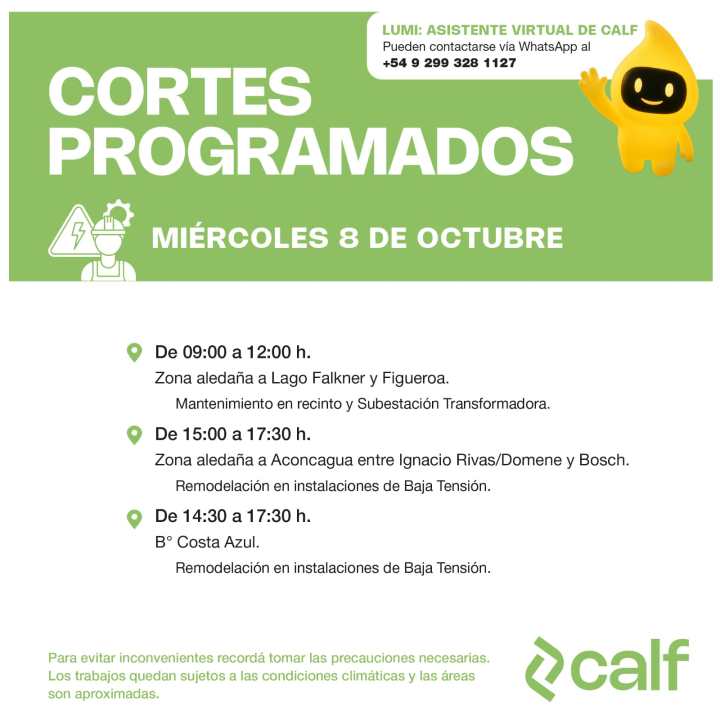 La Cooperativa de Agua, Luz y Fuerza de Neuquén (CALF) informó sobre un nuevo corte programado de luz este miércoles 8 de octubre. Será en la zona sur de Neuquén durante tres horas. El detalle de las áreas afectadas por la interrupción al servicio eléctrico.