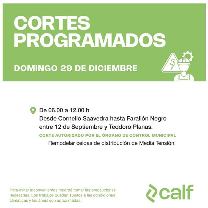 CALF indicó que este domingo 29 de diciembre realizarán un corte de luz programado de 6 a 12. Será desde calle Cornelio Saavedra hasta Farallón Negro, entre 12 de Septiembre y Teodoro Planas.