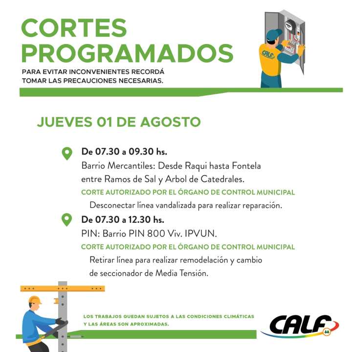 La Cooperativa CALF informó que a partir del martes y hasta el jueves se realizarían diversas labores de mantenimiento en Neuquén. Esto implica una serie de cortes de luz programados que afectan a varias zonas de la ciudad, como del Parque Industrial y del río Limay.