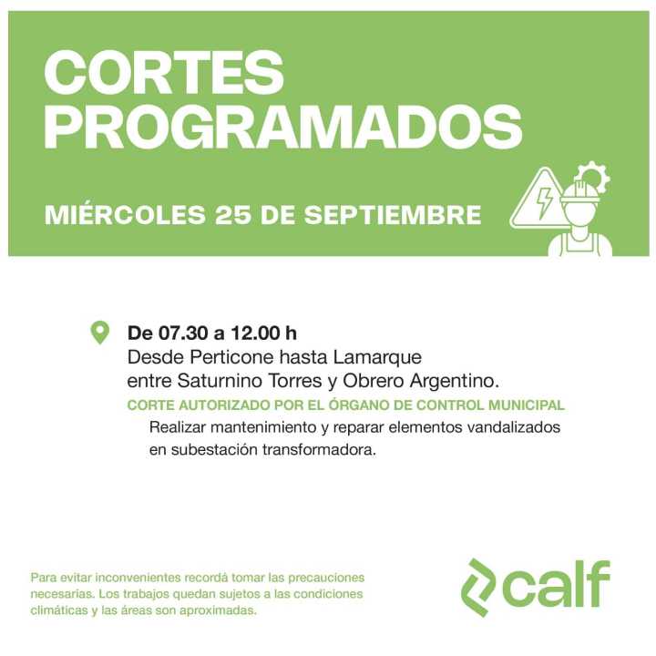 Desde la cooperativa CALF informaron que habrá una interrupción del servicio eléctrico.