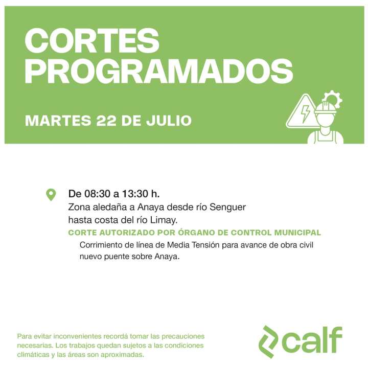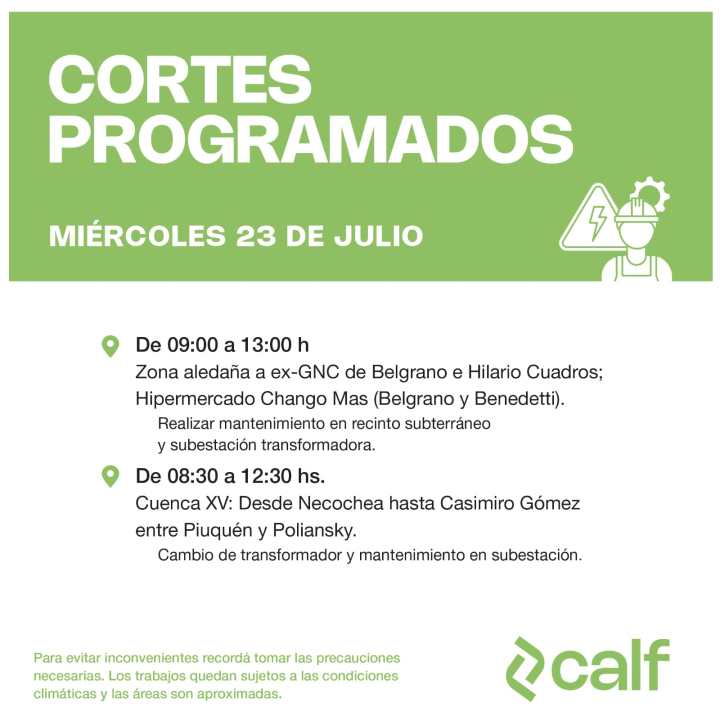 Desde CALF recomendaron tomar las precauciones necesarias durante las interrupciones programadas y recordaron que las tareas están sujetas a las condiciones climáticas.