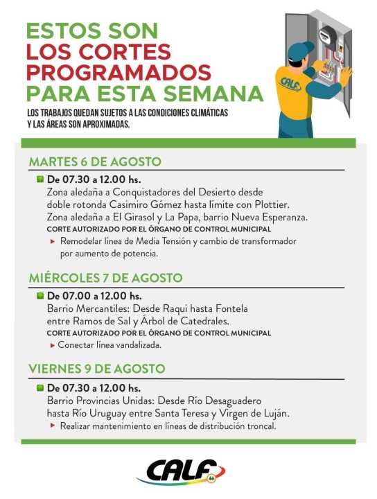 El viernes 9 entre las 7:30 y las 12 en el barrio Provincias Unidas, desde Río Desaguadero hasta Río Uruguay entre Santa Teresa y Virgen de Luján. Será para realizar mantenimiento en líneas de distribución troncal.