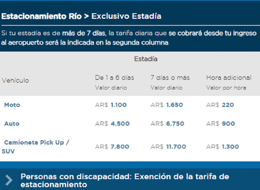 Según los valores vigentes publicados en la web de Aeropuertos Argentina, la estadía de un auto cuesta por día 4500 pesos argentinos hasta seis días. El monto aumenta desde el séptimo día a 6750 pesos argentinos diarios.
