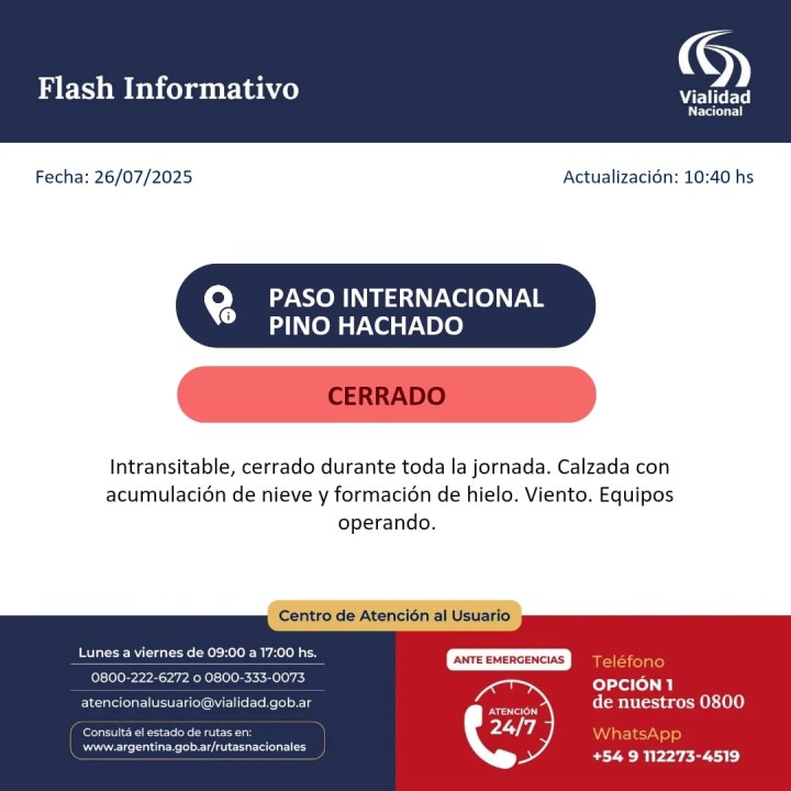 Se encuentra "intransitable", según el parte de Vialidad Nacional. Permanecerá cerrado durante toda la jornada.