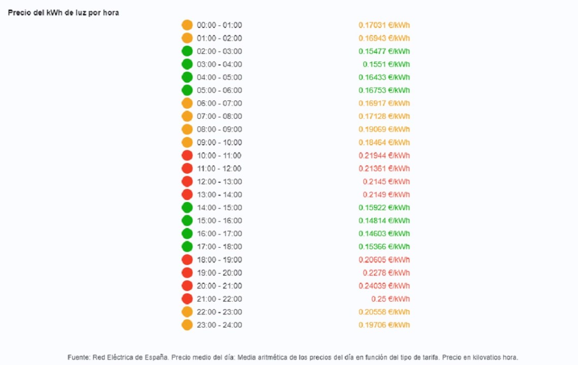 Por ejemplo, este lunes 3 de julio se recomienda hacer el mayor consumo de electricidad entre las 16 y las 17, hora local, ya que durante ese tramo el consumo por kilowat en España se mantendrá en 0,14 euros.