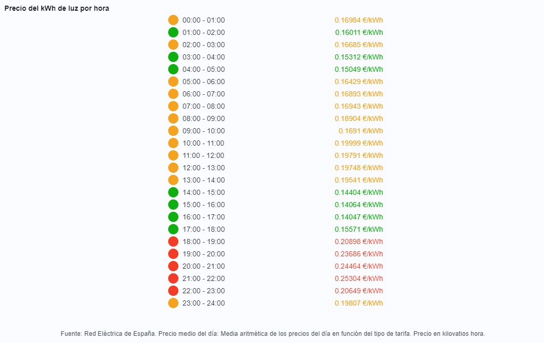 Por ejemplo, este martes 4 de julio en España se recomienda hacer el mayor consumo de electricidad entre las 16 y las 17, hora local, ya que durante ese tramo el consumo por kilowat se mantendrá en 0,14 euros.