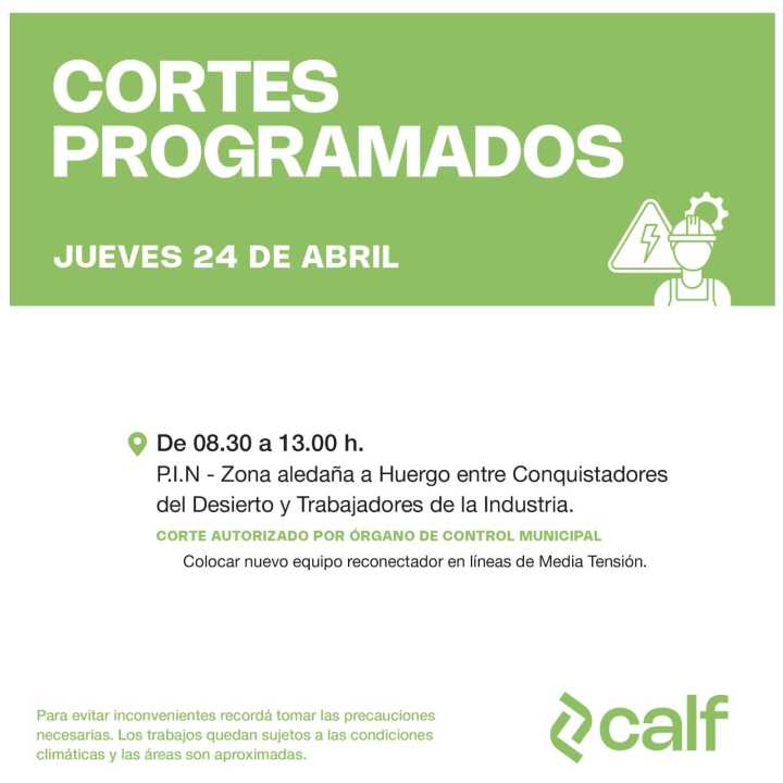 Según explicaron el corte será este jueves 24 de abril, de 8:30 a 13:00 en la capital de Neuquén. La zona afectada será P.I.N, en el sector aledaño a Huergo entre Conquistadores del Desierto y Trabajadores de la Industria.