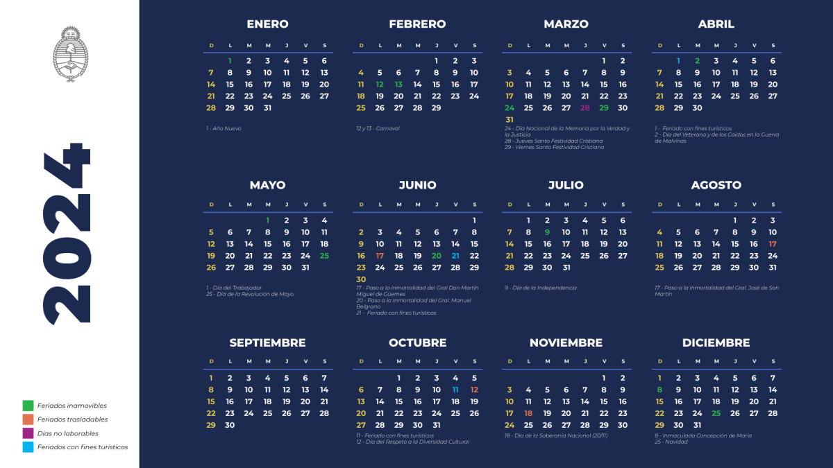 Días atrás el Ministerio del Interior había difundido el calendario de feriados nacionales 2024 que contará con 19 feriados, 12 de ellos inamovibles, 4 trasladables y 3 para fomentar la actividad turística.