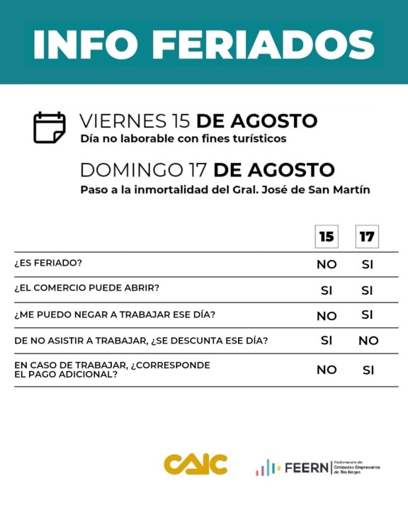 “En el caso de los feriados nacionales rigen las normas de descanso dominical. Es decir, que, en caso de que el empleado preste sus servicios durante el feriado, deberá cobrar el doble de una jornada habitual. Mientras que en los días no laborables, el empleador tendrá la opción de elegir si se trabaja y, si decide hacerlo, el empleado percibirá su salario simple”, explicó la Cámara de Agricultura, Industria y Comercio (CAIC) de Roca en sus redes sociales.