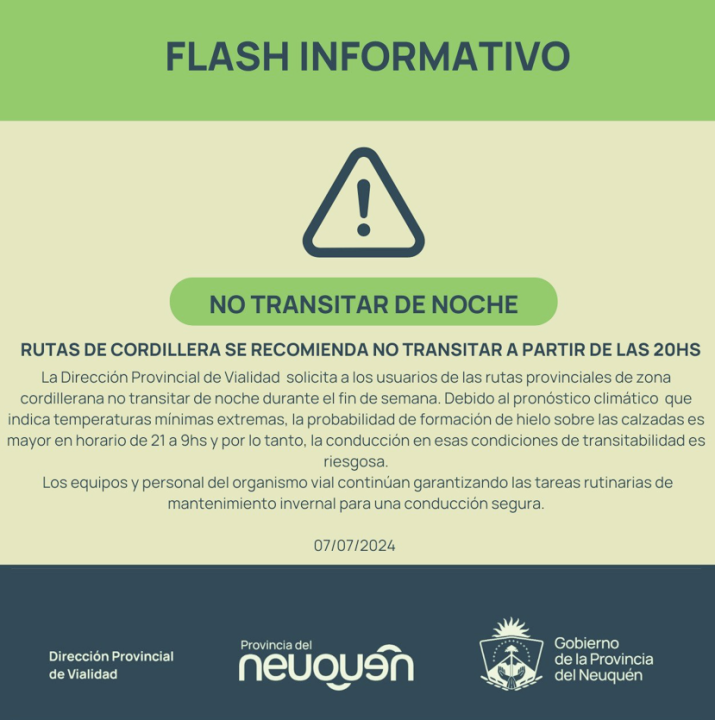 Las temperaturas bajas llegaron para instalarse en la región y desde Vialidad Provincial recordaron el pedido de no circular durante la noche en las rutas de la región cordillerana. Los detalles y recomendaciones.