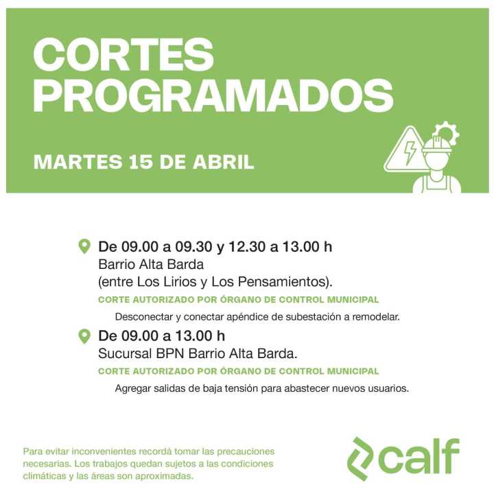La semana comienza con cortes de luz programados en Neuquén para continuar con las tareas de mantenimiento. La Cooperativa de Agua, Luz y Fuerza (CALF) informó los horarios y zonas donde el servicio se verá interrumpido este lunes 14 de abril y martes 15.