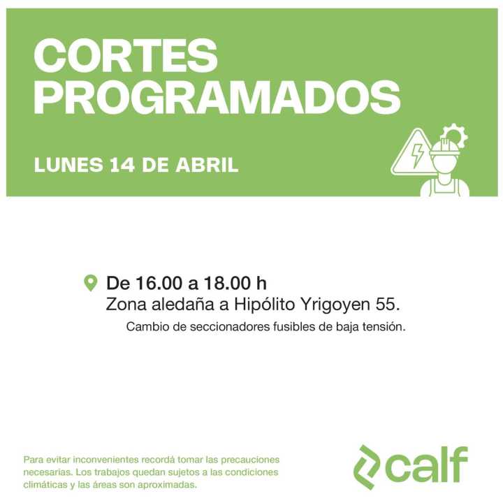 Este lunes el corte programado de CALF en Neuquén será por la tarde, de 16 a 18 en la zona aledaña a Hipólito Yrigoyen 55.