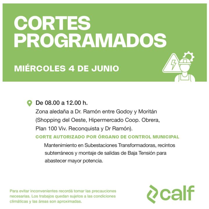 También habrá corte de luz programado durante este jueves 5 de junio. Será desde las 9 hasta las 12. Por lo que podría durar hasta tres horas. Según la Cooperativa, será para realizar mantenimiento en instalaciones de distribución troncal.