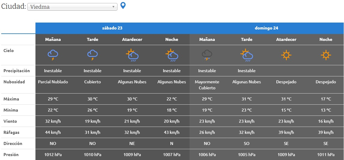 En Viedma, el domingo presenta una mínima de 13°C y una máxima de 31°C con ráfagas de hasta 39 km/h. El lunes y martes, las máximas rondarán los 27°C. Hacia el miércoles, el termómetro descenderá a 22°C y continuará fluctuando con probables lluvias hacia el final de la semana.