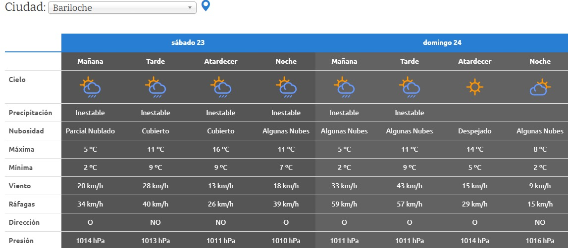 Bariloche enfrentará una semana lluviosa y fría. Este domingo comenzó con 2°C y una máxima de 14°C. Las lluvias serán débiles pero persistentes desde el lunes, con máximas que no superarán los 15°C.