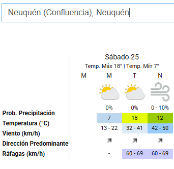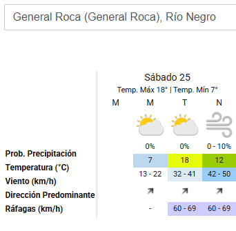 De acuerdo al pronóstico, este 25 de abril la temperatura máxima, tanto en Neuquén como en Roca, alcanzará los 18°C durante la tarde, mientras que la mínima se posicionará en los 7°C, ofreciendo un inicio y un cierre de día más frío.