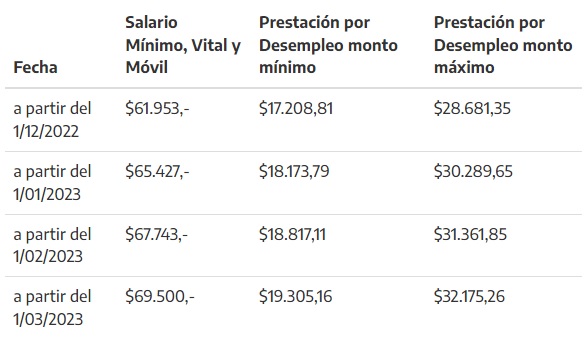 A partir del 1° de febrero rige el nuevo monto del Salario Mínimo, Vital y Móvil, que será de $67.743 mensuales y de $338,72 la hora. Además, también aumenta la prestación por Desempleo, el monto mínimo pasa a 18.817,11 y el máximo a 31.361,85 pesos.