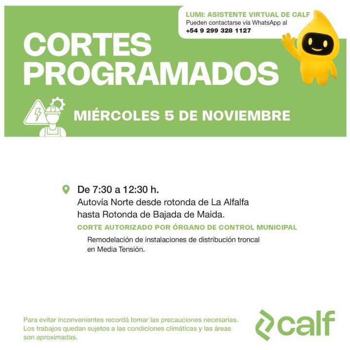La Cooperativa de Agua, Luz y Fuerza de Neuquén (CALF) informó un corte programado de luz que abarcará un sector importante de la ciudad sobre Autovía Norte este miércoles 5 de noviembre. Solicitan tener en cuenta los horarios para prevenir cualquier situación.