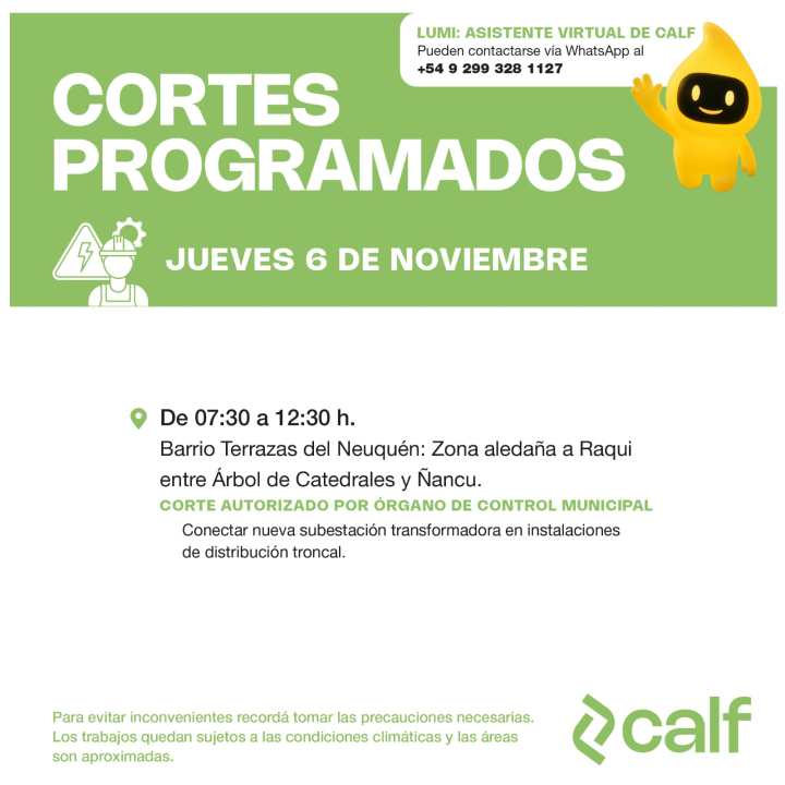 Servicio a la comunidad: CALF anunció un corte de luz programado para este jueves 6 de noviembre en Neuquén