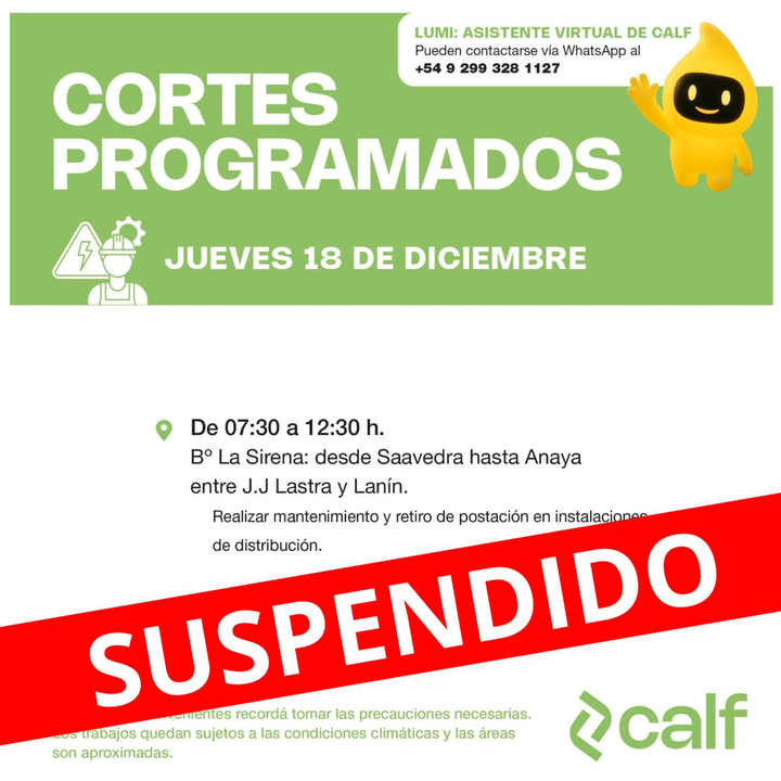 La Cooperativa de Agua, Luz y Fuerza de Neuquén (CALF) informó un corte de luz programado en la ciudad de Neuquén para este jueves 18 de diciembre. Sin embargo la actividad se vio suspendida hasta nuevo aviso.