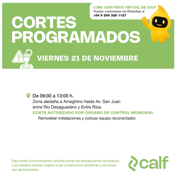 Servicio a la comunidad: CALF anunció un corte programado de luz para este viernes 21 de noviembre en Neuquén
