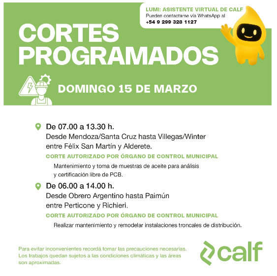 La Cooperativa de Agua, Luz y Fuerza de Neuquén (CALF) informó dos cortes programados de luz que alcanzará a dos sectores de la ciudad de Neuquén el próximo domingo 15 de marzo