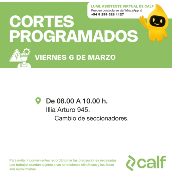 La Cooperativa de Agua, Luz y Fuerza de Neuquén (CALF) informó un corte programado de luz que abarcará a un sector de la ciudad de Neuquén el próximo viernes 6 de marzo.