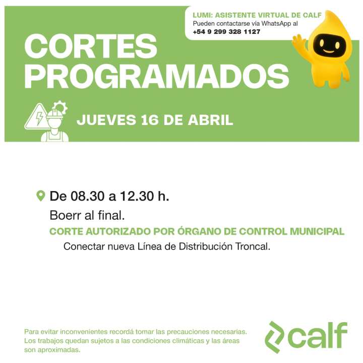 La Cooperativa de Agua, Luz y Fuerza de Neuquén (CALF) informó un corte programado de luz que alcanzará a un sector de la ciudad de Neuquén este 16 de abril