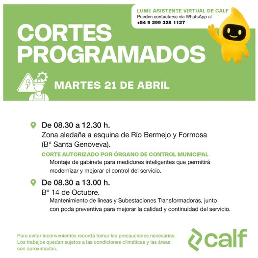 La Cooperativa de Agua, Luz y Fuerza de Neuquén (CALF) informó un corte programado de luz que alcanzará a un sector de la ciudad de Neuquén este martes 21 de abril