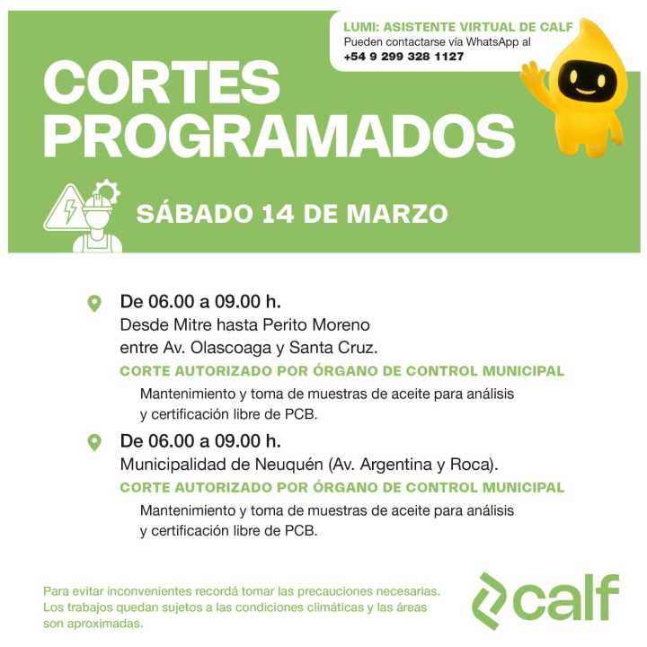 La Cooperativa de Agua, Luz y Fuerza de Neuquén (CALF) informó un corte programado de luz que abarcará a un sector de la ciudad de Neuquén el próximo sábado 14 de marzo.