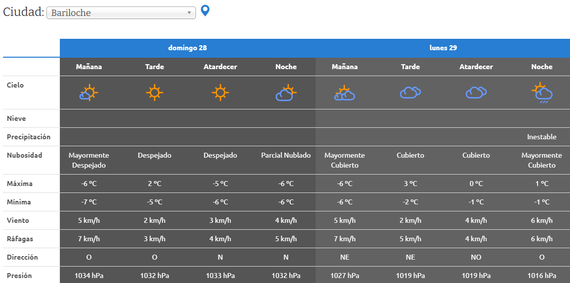 La lluvia en la región andina se anticipará. Aunque el martes será el día con mayor temperatura, registrando una máxima de 4°C; el miércoles llegará la inestabilidad a la comarca. Debido a esas bajas temperaturas que se vivirán, las lluvias se transformarán en neviscas. Por lo que, habrá que estar atentos a posibles recomendaciones de Vialidad Nacional.