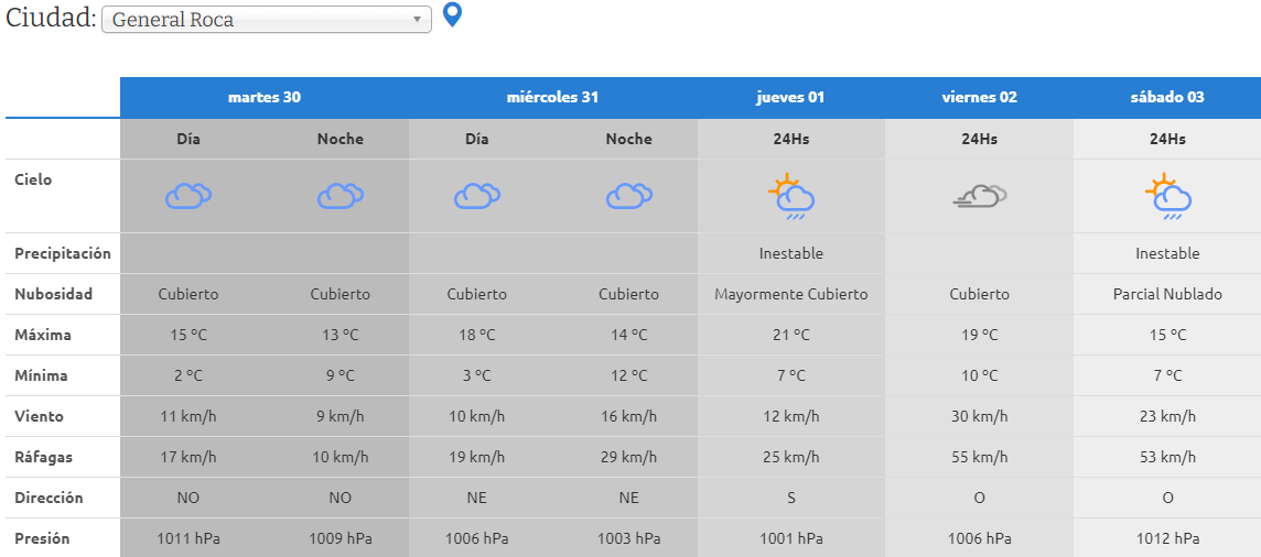 Si seguimos en el Alto Valle, pero nos mudamos unos kilómetros al este, nos encontramos en Roca. Allí, la situación se prevé similar a la de la capital neuquina. Con los fríos registros del domingo, el clima recuperará el calor que vivió al inicio de la semana pasada.