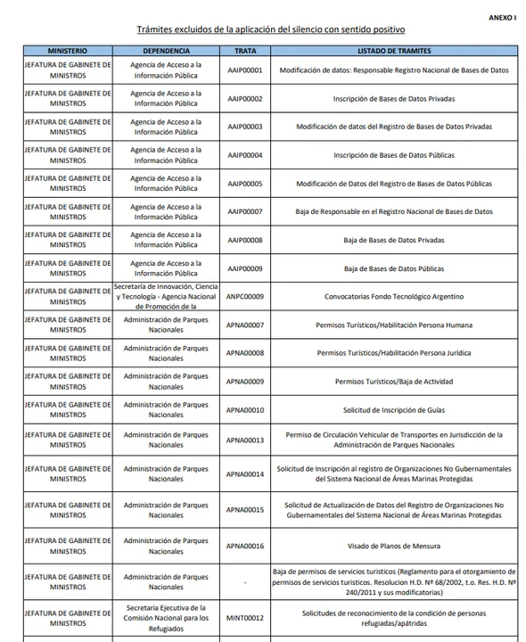 El Decreto 971/2024 se complementa con dos anexos que definen con precisión cuáles son los trámites sujetos al silencio positivo y cuáles están excluidos de su aplicación. En el Anexo I se incluyen aquellos trámites exceptuados del silencio positivo, como autorizaciones en áreas sensibles y servicios esenciales.