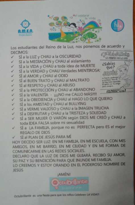 Según familias de estudiantes del AMEN, este panfleto se repartió durante el «Octubrillante», una celebración que organiza el colegio en contraposición a Halloween.