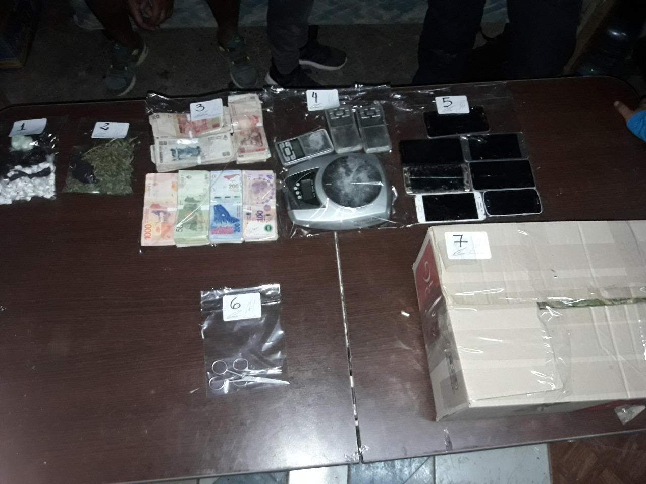 Allí secuestraron más de 200 dosis de cocaína, más de 50 de marihuana, cerca de 100 mil pesos, cuatro balanzas de precisión, dos plantas de marihuana con cogollos, casi 500 gramos de cogollos y hojas de la misma planta, 16 celulares, un revolver calibre 22 con nueve municiones, cartuchos calibre 16 y elementos de corte y fraccionamiento.